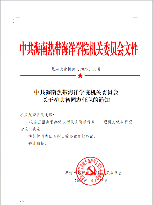 中共海南热带海洋学院机关委员会关于柳其智同志的任职通知